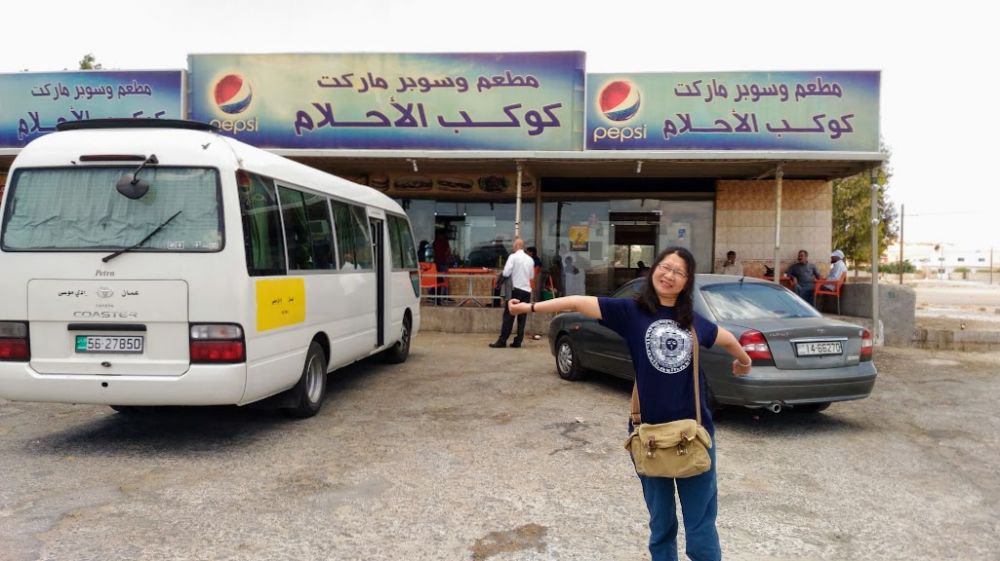 從安曼到南部的佩特拉(Petra),至少要三小時的車程,小慶和昨天的計程車司機約好八點來接去巴士站,想搭早班巴士到佩特拉。司機說安曼有兩個巴士站,一個往北一個往南,所有安曼往南的巴士都停靠在這個大停車場。現場已停了很多大巴士和中型巴士,司機幫忙找到了往佩特拉的中型巴士,看小艾他們上車後才離開。等了一會兒,小慶納悶地說,這巴士站很奇怪,沒告示牌、沒售票窗口,也沒有售票員、完全不像巴士站啊!若沒司機幫忙,不知要詢問多少人,才能找到去佩特拉的巴士?首都車站怎會這樣啊!左等右等,九十分鐘都過去了,司機才開始收車資(7 JD/位),原來是要等人坐滿才發車,那也可能等更久喔!