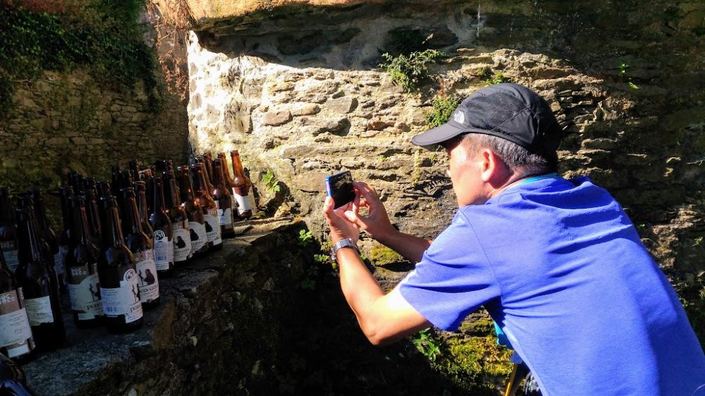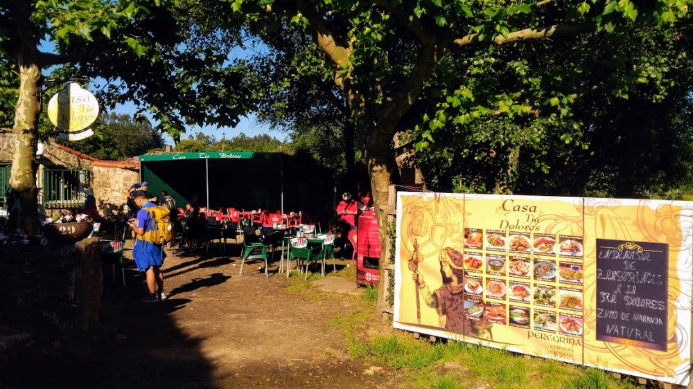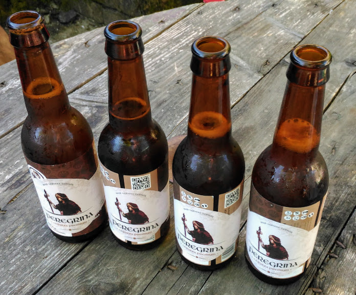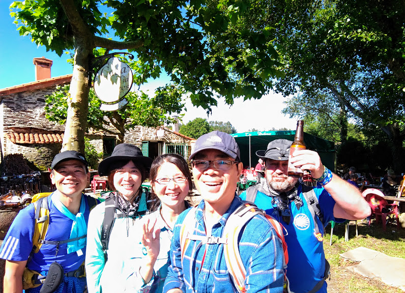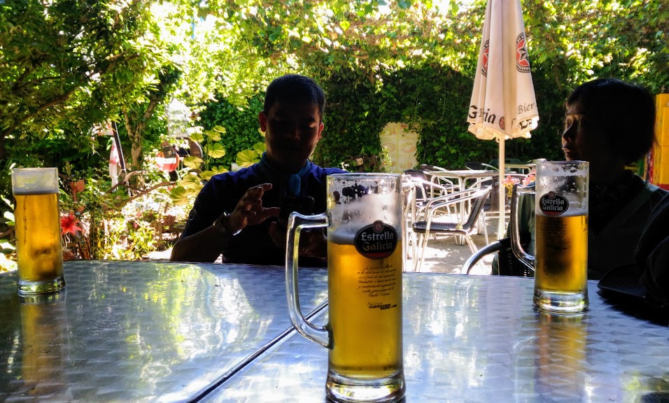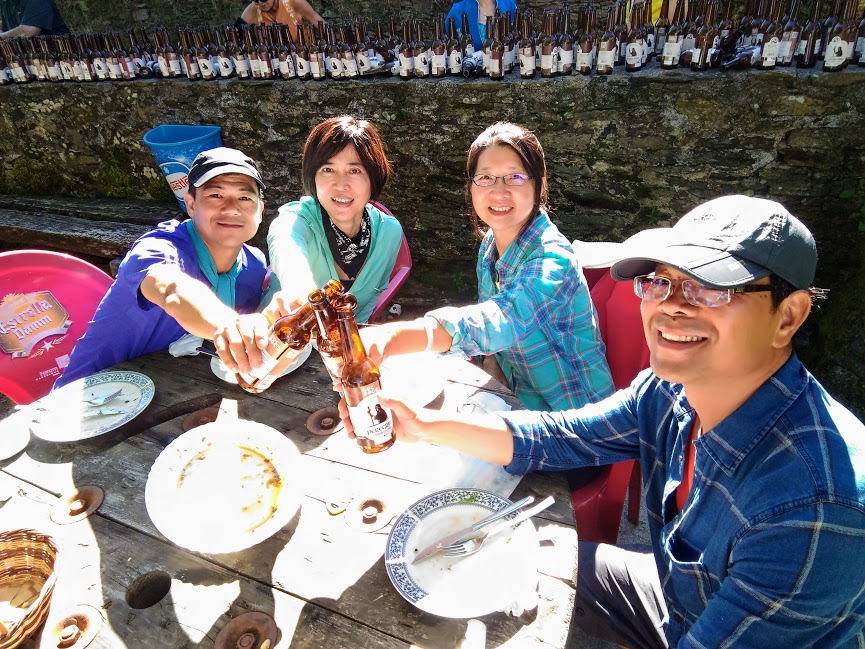 今天第二次休息的餐廳很有特色,位在必經之路的轉角處,每個人一轉彎看到矮牆上排滿數百個啤酒瓶,就會停下拍照。這些酒瓶上都印有朝聖者人像,好像是朝聖健行者的專賣店一樣。四人覺得很有趣就決定在此享用早午餐,一人一瓶啤酒,各點一道Tapas,擺滿了一桌,果然是人多好叫菜。最好吃的一道菜是烤扇貝,原汁原味、秒殺吃完只剩空殼照相。這扇貝殼就像朝聖健行的圖案徽章,請老闆洗乾淨當作紀念品。