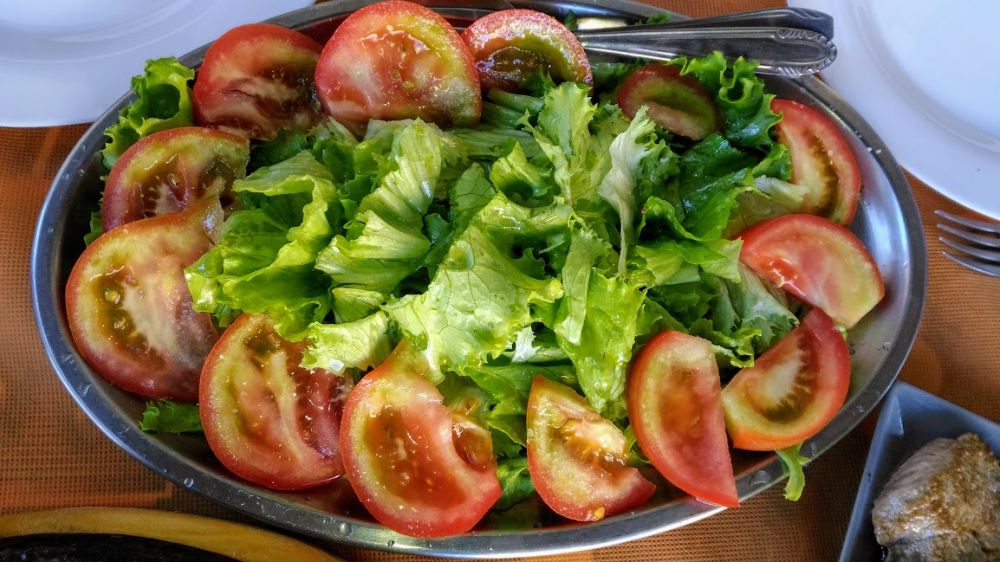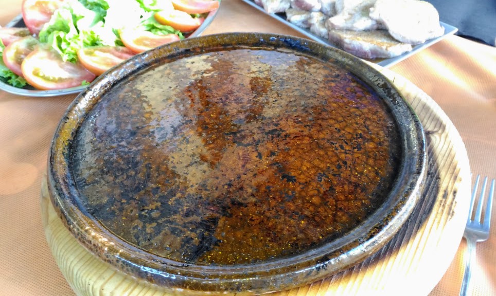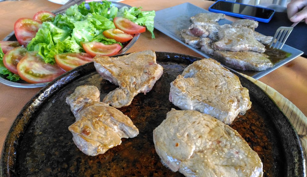這幾天,幾乎在每個歇腳的店家都是四杯冰啤酒配西班牙小吃,只要看到不同的Tapas就會點來嚐看看,這種天天健行又開懷大吃大喝的感覺,真的好爽,好懷念啊!今天來到比較熱鬧的城鎮,晚餐換個口味,吃當地最熱門的現烤肉排。把半熟的牛肉排,放到很熱的鐵盤上,邊烤邊吃,很嫩的肉排搭配番茄和蔬菜,健康好吃又有趣。為何這一路上的食物都超好吃的呀!