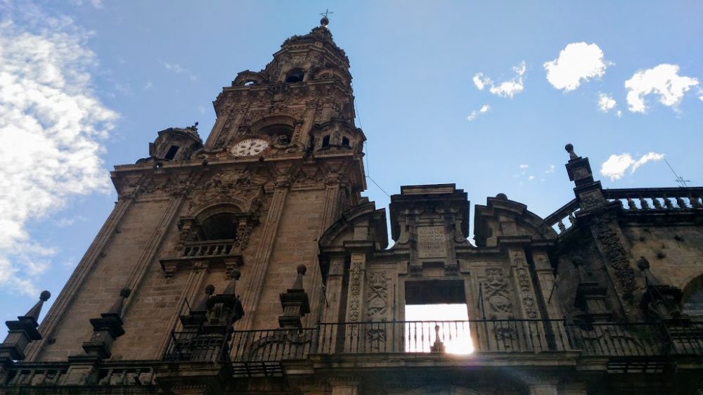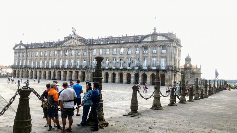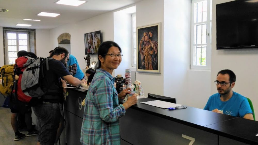 聖地牙哥大教堂的外觀是穩重莊嚴的石頭顏色,沒有鮮明的色彩,也沒有華麗的裝飾,為何值得千辛萬苦來朝聖?在等候領證書的庭院長廊上,周遭的人都有些面善,都是這五天在路上同行的人。輪到小慶小艾領證書了,承辦人員很親切地恭喜他們,在填寫的基本資料中,有個勾選項目是為何來參加朝聖健行?宗教、心靈、觀光旅遊,三選一,小艾不是天主教徒,所以勾選了心靈。在這五天的健行路上,的確有很多時刻都和自我的心靈對話。人往往在肉體最勞累的時刻,心靈分外清明;走一趟朝聖健行是永遠的回憶,心靈的收穫是最豐富的。