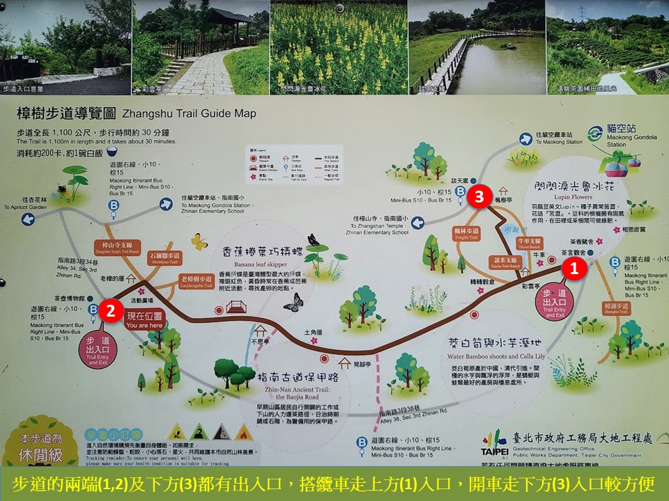 樟樹步道的入口有兩處,一處位於貓空纜車站附近,指南路三段38巷「茶言觀舍」餐廳左側,另一處在下方,指南路三段34巷「談天園」對面。我們是開車前往,非假日很好停車,從下方入口開始探訪步道。步道路面鋪設花崗石板,沿途感受到規劃好的農村風情:牛車、埤塘、茶園、穀倉、花園、果園、菜園、農舍等等,都是親子共遊的開心素材。