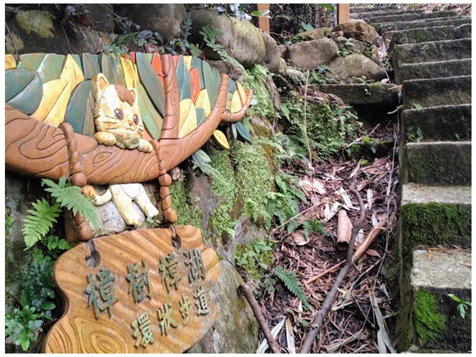 樟湖步道全長2.2公里,石板路面平緩好走,林蔭較多更舒暢。樟樹、樟湖兩步道可連成一條環狀步道,慢慢逛遊一圈約需2.5小時。樟樹步道充滿農村風情,樟湖步道則是一條音律廊道;各有特色,漫步其間,明顯感受到設計者的心意。或許是因為台北地少人多,經費也充裕,一條郊山步道也要做出特色。