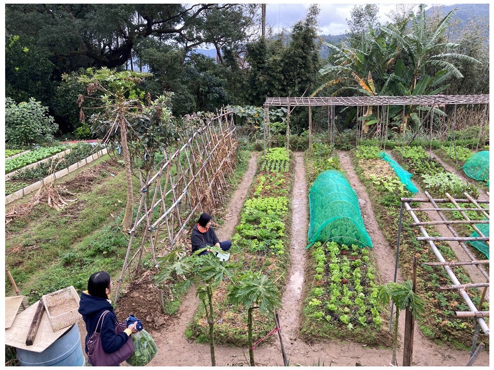 轉轉穀倉是一個可愛又有創意的設計,可以坐下休憩,也可以轉動玩樂,大人小孩都會駐足賞玩。橘子樹結實纍纍,大吉大利好兆頭。滿園茶樹盛開著小白花,是不是也叫茶花?菜園的女園丁拿著毛筆在幹嘛?以為是授粉,她說是在抓蟲啦!有機耕種不容易,自己種菜自己吃,多的才賣給有緣人。今天我們和她有緣,買了一百元蔬菜回家,覺得很有趣。樟樹步道的終點是百年樟樹林,告別「老樟的厝」,我們轉往樟湖步道。