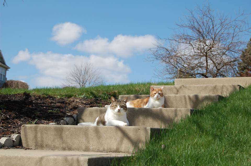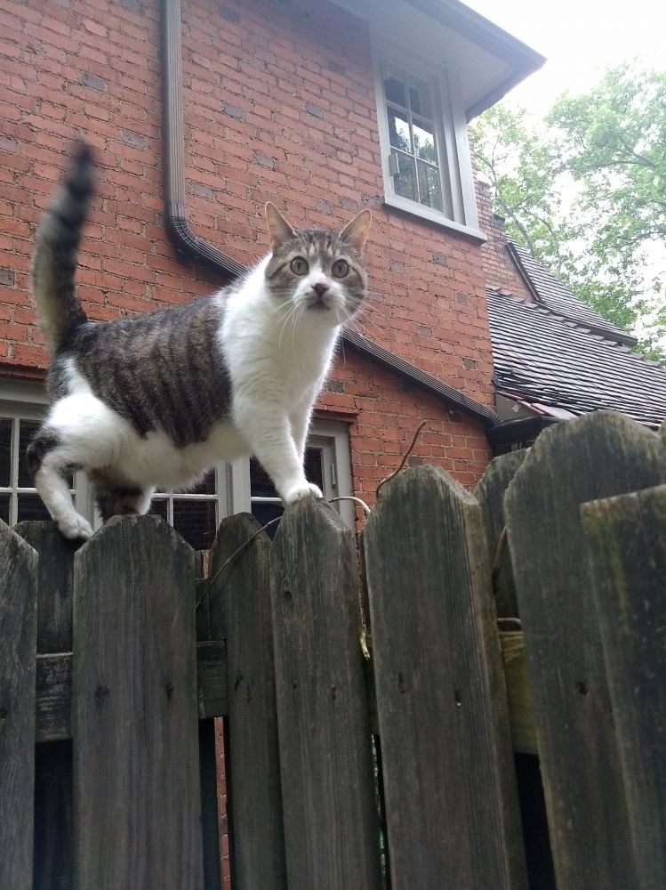 花花是个好猎手,身手极佳!不喜欢老把猫咪关在屋里,他们也需要晒晒阳光,吃吃草。可几尺栅栏上下攀爬,后院根本关不住花花。我家原来院子周围全是小动物。飞腾的小鸟,跑的极快的兔子,松鼠都曾是花花手下败将。每次大呼小叫的从他口里救出猎物,将他赶回家。他很不甘心,瞅个机会溜出来,去他松口猎物的地方去找。一次他将一只漂亮的花栗鼠逮进了屋,他也不吃,又在屋里把花栗鼠放了,估计是想和他玩儿?吓得我指挥着一边控制花花,一边抬沙发,用棍子把花栗鼠救到了屋外。我们还看见过一只鸟妈妈连续攻击花花,不用说,他肯定骚扰过人家,现在遭到了报复。。。可以说他是三只猫中最快乐的,既保持了动物本性,享有扑捉猎物的乐趣,又有一个随时向他敞开的家门。