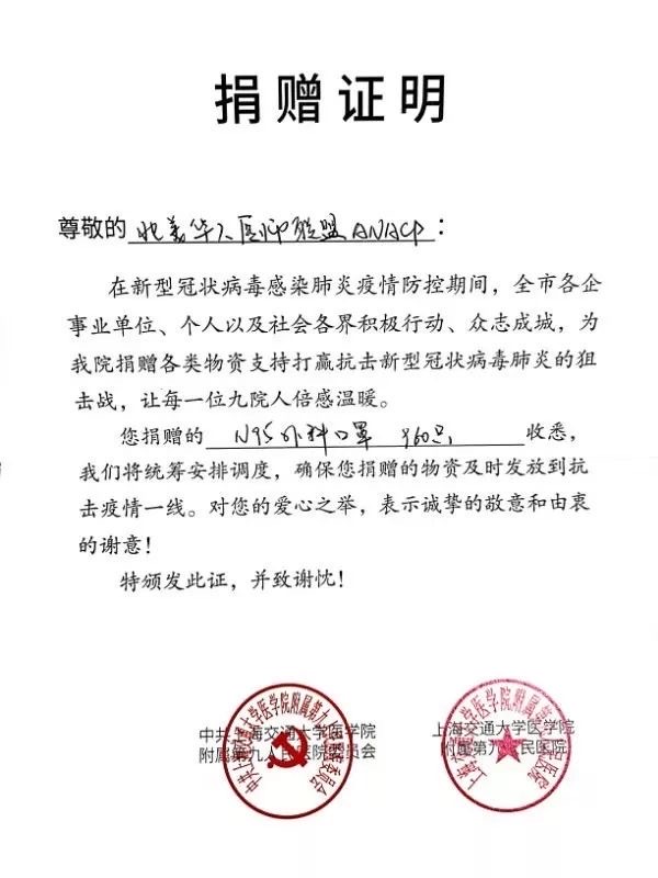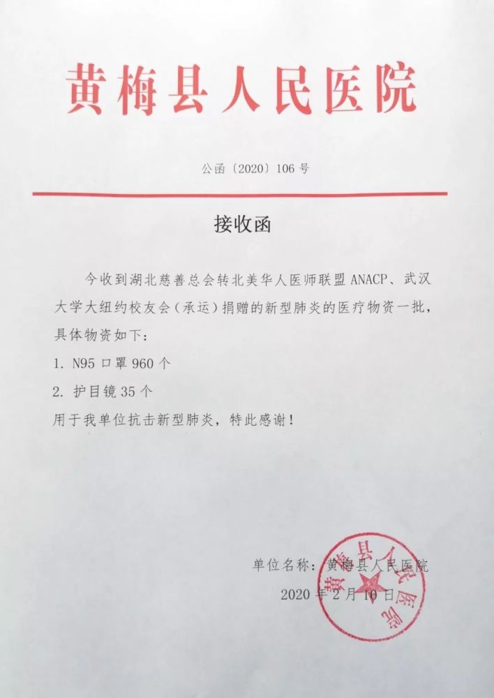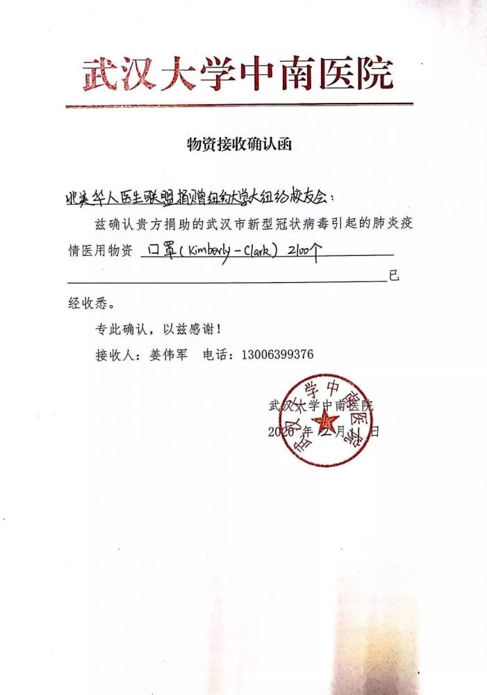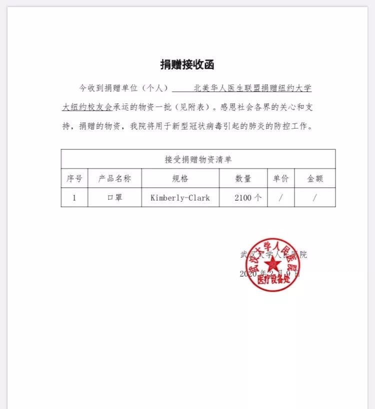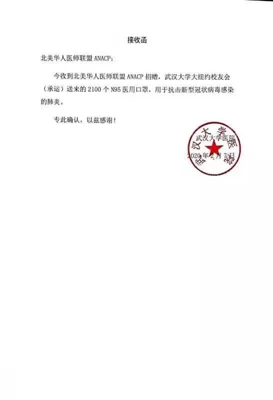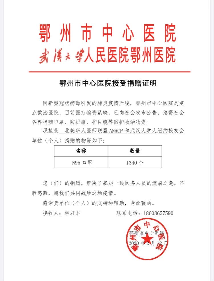 谢谢各位的捐款与支持,联盟已不再接收捐款了,因为这里的医用物资也紧缺。联盟一直密切关注国内的疫情,从医疗,物资上尽力帮助。我们会定期向大家报告进展。刚刚又收到武汉大学人民医院鄂州医院的接受证明,会更新。
