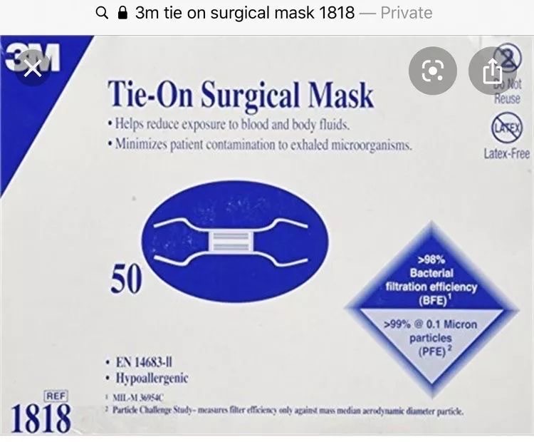 1. N95 respiratory and surgical mask: 这种口罩主要用于减低,但并不能完全消除医务人员暴露在空气传播性疾病的危险。比如接触结核或者coronavirus 病人的医务人员一般要用N95。医用N95的特点是密封性能好,对于0.3 micro 颗粒有95%的滤过效果。同时又有防水层。这种口罩除了对一些微生物有防护作用以外,对血液,体液,飞沫也有一定的阻挡作用。常用的医用N95有这几种不同的品牌。比如3M 1860 ,1860s, 1870 等.