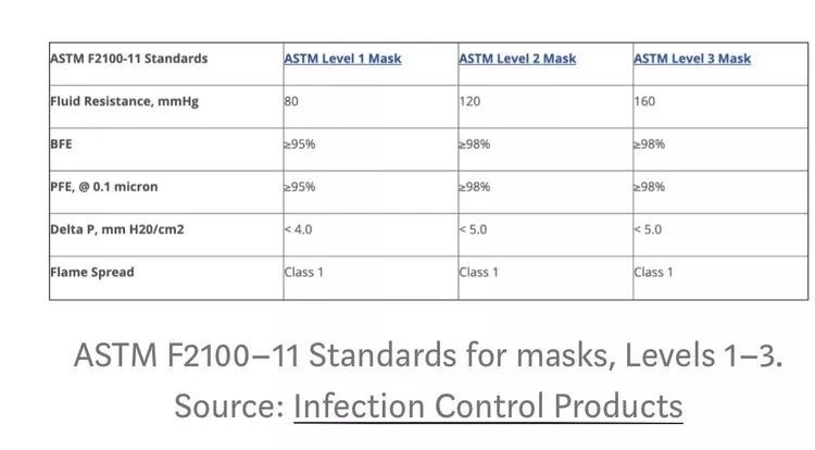 2. 美国的行业标准和中国的好像有差异,根据中国的行业标准,似乎是level 2的才算外科口罩。主要是fluid resistance的区别,中国是要求120以上的。美国好像80以上都算。这个理解是否正确?