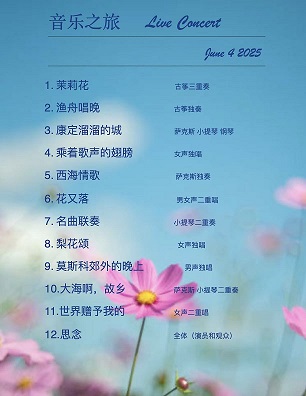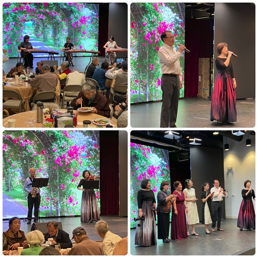 老人们一边吃,一边看演出。没想到组织得相当正式,还有节目单,制作的相当精美。琴友事先还通知我,穿著要整齐。节目有合唱、独唱、古筝、萨克管,小提琴等。我的节目是和琴友拉二重凑,拉了三个曲子,宗教歌曲Nearer My God to Thee,电影《音乐之声》插曲“雪绒花”,意大利民歌“我的太阳”。其他演员都不认识,都比我年轻,有几个人是中午请假出来,下午还要回去上班。