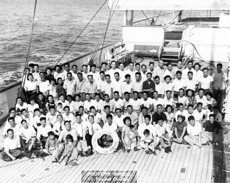 下面是回国船上的照片,前排左起第五人是戴誉斌,前面的孩子是别人的。