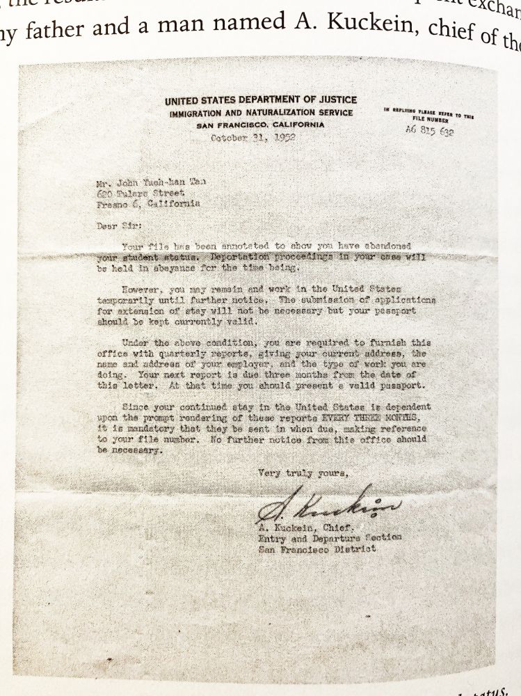 以前看过Amy Tan写的一本书《The Opposite of Fate》,说到父亲为了逃避一段感情纠葛,申请到美国读书。最近看她的另一本书《Where the Past Begins》,讲自己的成长过程,又谈到自己的父亲。因为持学生签证,父亲曾面临被驱逐出境的困境,与移民局官员有过十几封来往信件。书中展示了其中的一封信,为历史提供了一份珍贵的资料。