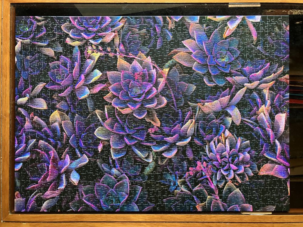 通常一幅拼图拼完以后就拆掉,装回盒子里,捐给二手店。要是花的时间比较长,舍不得拆,就粘起来挂在墙上一段时间。上面这副拼图花的时间最长,一定要挂起来。