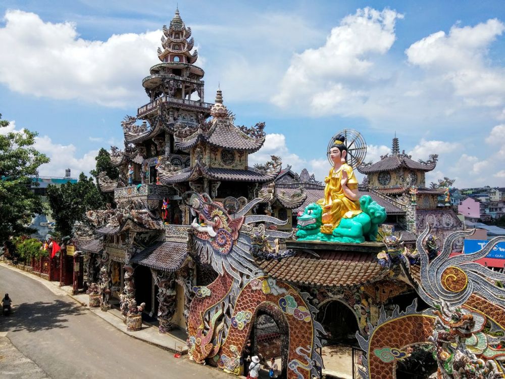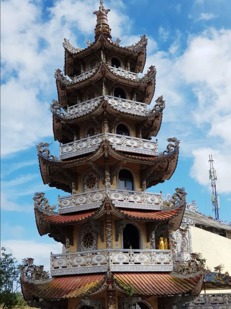 灵福寺(Linh Phuoc Pagoda)是越南最著名的寺庙之一,因为这里有越南最高的钟楼。灵福寺距离大叻市中心 20 分钟车程,许多当地人称它为“瓶塔”,因为寺内有一条 49 米长的龙雕像,由 12,000 个回收的啤酒瓶制成。同时,主殿内有描绘佛祖生平的彩色绘画。这座著名的钟楼高达 37 米,您可以将自己的愿望写在一张小纸条上,贴在钟楼中央。