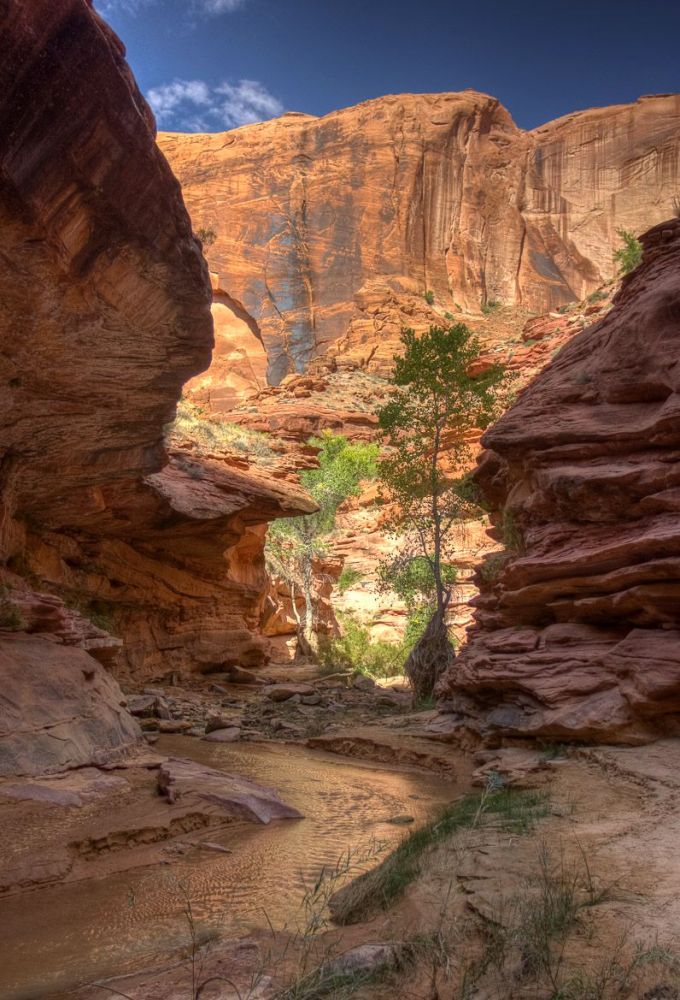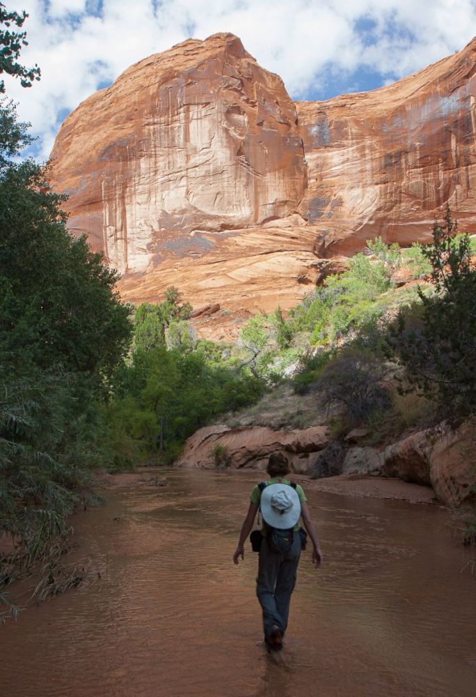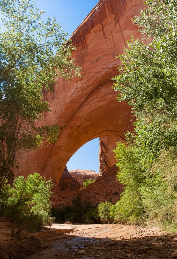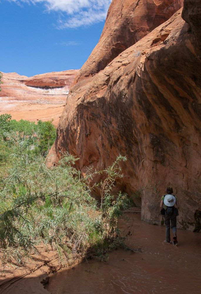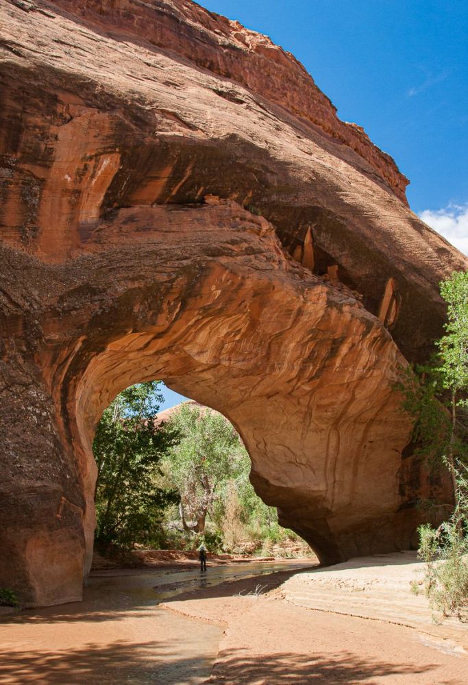 我们在距离小溪入口 4.0 英里/6.4 公里处遇到了 Coyote Gulch Natural Bridge。这可真是一次邂逅!小溪和徒步旅行者都从这里穿过。