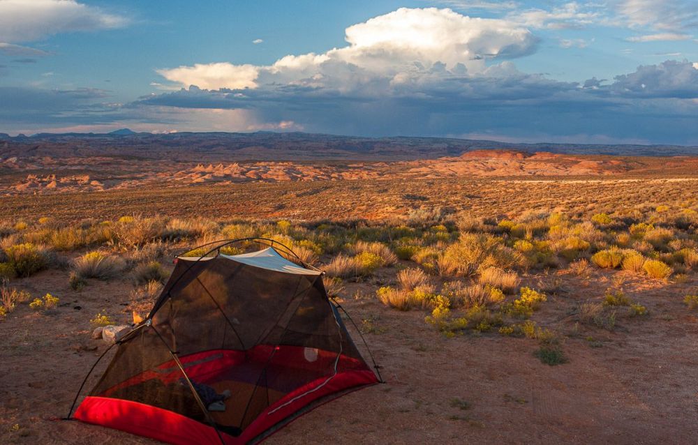 没有人能在 Hole-in-the-Rock 路上开得开心。对于一条泥土和碎石的偏远地区道路来说,这条路的状况真的不算糟糕——你可以用两轮驱动车行驶大部分路程。但这次徒步旅行的起点 Crack-in-the-Wall 距离最近的埃斯卡兰特镇不到 50.0 英里/80.5 公里。而且这条路上的车辙和搓板路阻碍了你加速。所以我们前一天开车去了,在去的路上经过了 Zebra Slot Canyon,然后在附近露营,以便早点出发。我们欣赏到了远处风暴的壮丽日落美景。