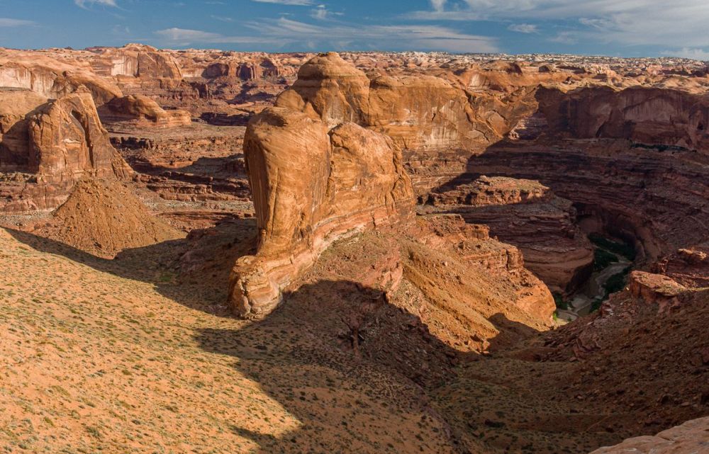 我们到达峡谷边缘后,可以一直看到埃斯卡兰特。从上面看,史蒂文斯拱门后面有更多的砂岩,我们无法发现它。再往下看,天空照进了洞口,我们终于可以看到它在哪里——一直藏在显眼的地方。
