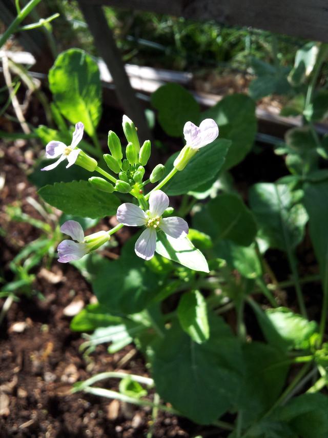 这几年能买到的萝卜都是韩国运来的,飘洋过海的也不知道有多久了,所以有一次在Home Depot看到有萝卜籽就买了一小包,撒在小菜地里。不知道是当地的地气过暖还是季节不对,实在是收获寥寥,很不好意思说的,幸运的是等到了萝卜花开,轻轻浅浅的紫色在晨光里铺展着,很有小家碧玉的那份雅致和安静,很是不俗,算得上是意外之喜。