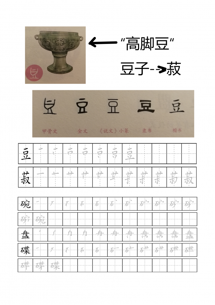 (十)几个装食物的容器比较好玩,“鼎”相对熟悉,正好复习一下故事;“簋”是第一次见,娃爸也念不出来,所以娃很开心地挣了一个硬币;“豆”就更奇怪了,完全不同于现在的认识。叫娃描了几个餐具的字。