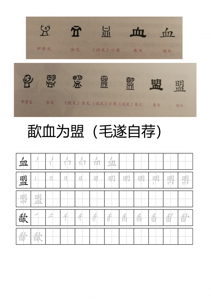 (十一)“血”和“盟”的字形演变也是第一次见,但是娃不太明白的样子,回顾了一下毛遂自荐的故事。
