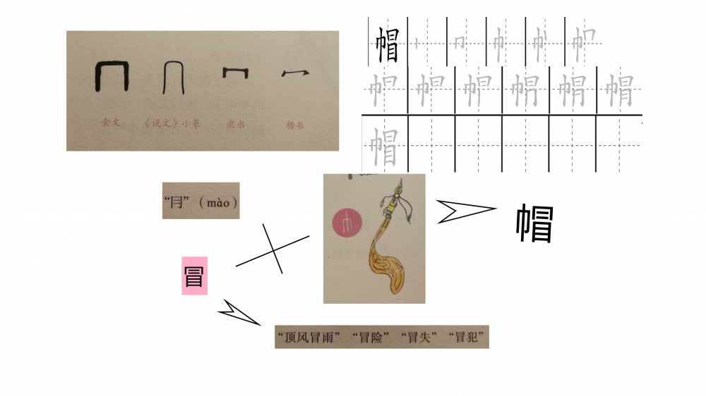 (三)今天的字:表 里这两个字的字形变化比较好理解,啰嗦的最多的地方是“表亲”和“堂亲”的区别,之前为了让娃叫清楚堂姐堂哥表姐表哥费力不讨好,这会子好像有点明白了。(四)今天的字:帽,冠,冕,弁“帽”字的变形还是很有意思的。“冠”的读音有点绕,娃估计还是糊涂。“冕”和“弁”很不熟悉,回头再看。