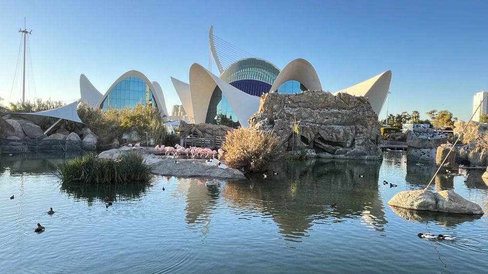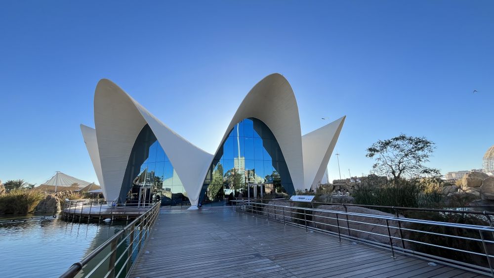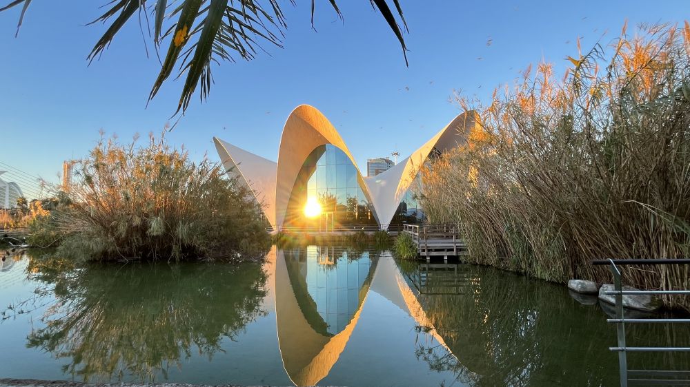 就艺术科学城本身而言,建筑师的设计可以说达到了人类与自然的高度和谐。天文馆和科学馆完全建在河床上,歌剧院主体建在河堤上而底层在河床,植物园和海洋世界都建在河堤上,几大建筑上上下下错落有致,两座大桥就像是两条飘带,飞舞在中间。大面积的水面,正是河流充沛的自然资源,取自不尽用之不竭。水让干枯的河床恢复水生生态,让干旱缺水的瓦伦西亚有了灵气,也让奇妙建筑更加神秘科幻。从桥上、堤岸上、或水面旁观看整个艺术科学城,你会欣赏到不同的风景和建筑美,你在城中游,你是城中景,留在了不知在哪个位置的游客的美照中。
