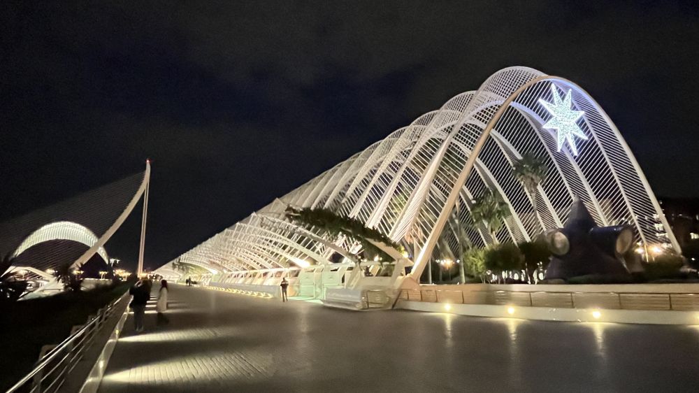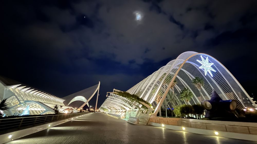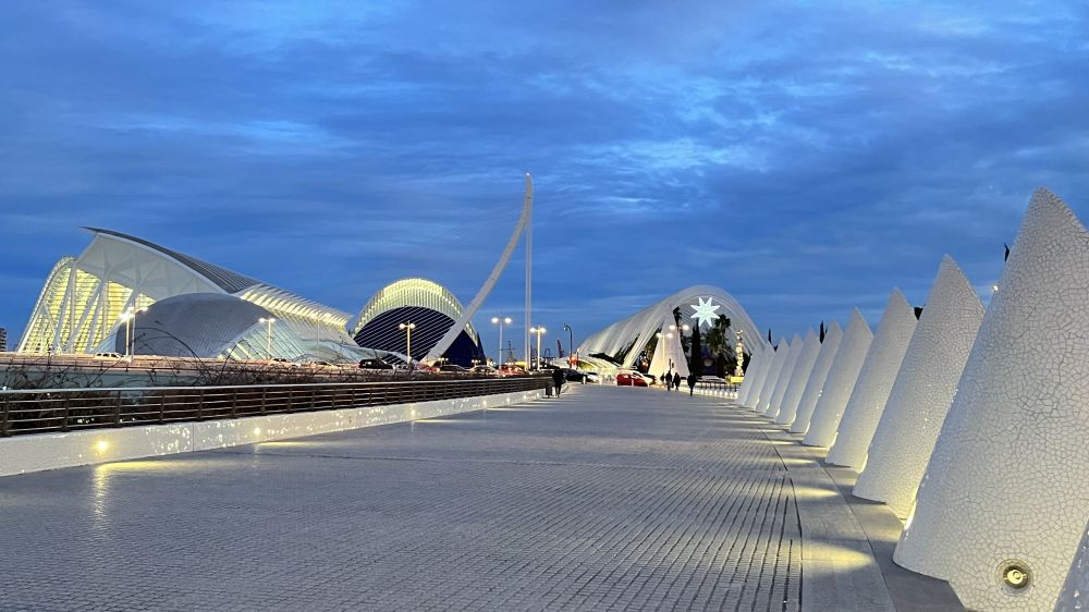 下榻在新城,就先从艺术科学城游起,然后再游古城。艺术科学城是集艺术、科学、娱乐、自然于一体的一个复合型区域,前有海港后有老城。城里的明珠是一组精彩绝伦的雕塑式功能性建筑群,集文化和娱乐于一体,为游客和居民创造了独特的旅游休闲体验。艺术科学城包括索非亚皇后艺术歌剧院、天文馆、费利佩王子科学博物馆、多功能会展馆,海洋世界、植物园和两座堤坝大桥。这组造型奇异绝美的建筑,气势磅礴地从北向南一字排开,大面积的水面设计更是神妙点睛之笔,让这些建筑仿佛是漂浮在海洋中的梦幻之岛,不愧为西班牙的十二瑰宝之一。