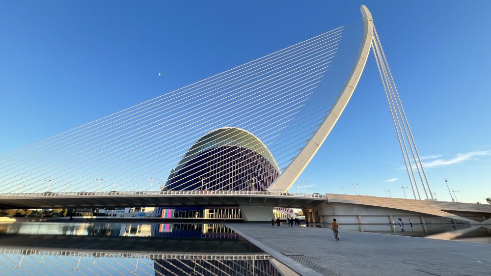 植物园内种满了瓦伦西亚当地的原生植物,爬藤沿着网架逐年向上蔓延,白色钢网变成了一条大尺度的生态绿廊。植物园及其下面的车库构成一道绿带,屏障了城外的喧哗。这是一个露天花园和艺术画廊,步行道经常有各种艺术展,为游客提供了在郁郁葱葱的植被和当代雕塑中悠然漫步静思的时光。斜拉大桥:拉起一轮上玄月