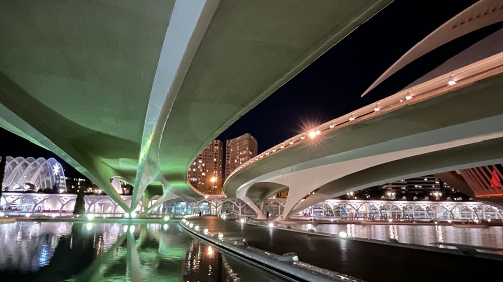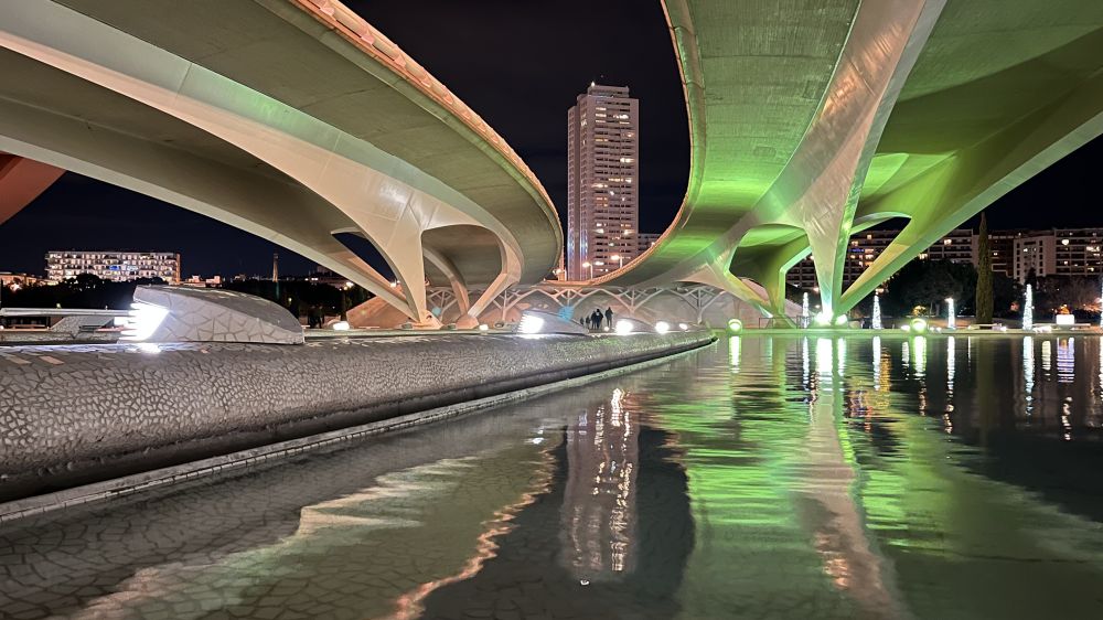 在大多数艺术科学城的介绍中,两座堤坝大桥是被忽略,这是不公平的。两座大桥是被建筑师作为不可或缺的部分加入艺术科学城整体设计中的,被忽略只因为他们没有发现两座大桥本身的美和它们对艺术科学城整体美的贡献。斜拉大桥拉起的不仅仅是一轮上玄月,拉起的是艺术科学城浪漫情怀,大桥下面的水光玄幻,映射的瓦伦西亚优美的线条和动人的美艳。