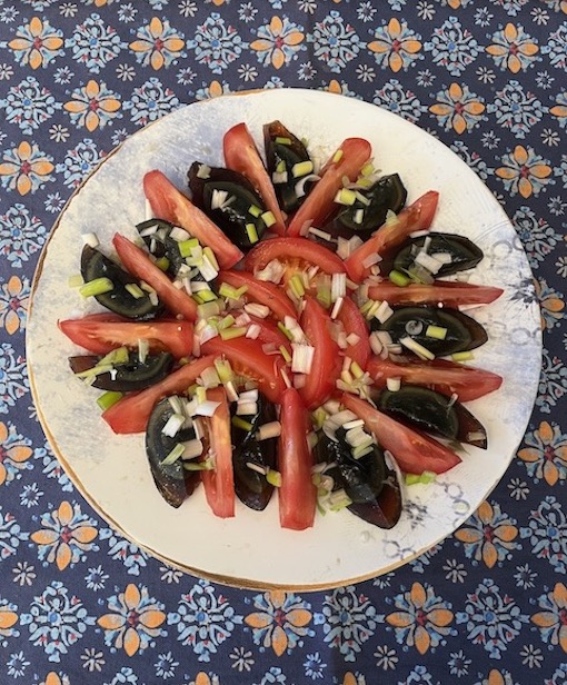 想到自己好久好久了都没有买皮蛋回家, 只是偶尔在餐馆吃皮蛋瘦肉粥. 遂, 郑重其事的去超市买回一盒 6 枚装的特大松花皮蛋. 我也来做一道真言做的凉菜. 圆圆的象牙白色瓷碟之上, 整齐铺排的红彤彤西红柿, 切成瓣片, 与切成月牙状的黑不溜秋的皮蛋, 相依相偎, 撒一小撮葱花, 顿添活泼. 味道如何呢? 皮蛋的溏心绵密, 透明的褐色胶质层脆嫩, 葱鲜香, 西红柿的酸酸甜甜, 完美中和蛋蛋涩涩的碱味, 而黑曜石的厚腴, 愈发烘托红玛瑙的清纯, 一矣入口, 噢, 万千味蕾为之开启细致的敏锐, 那份满足感, 教人沦陷其中难以自拔.