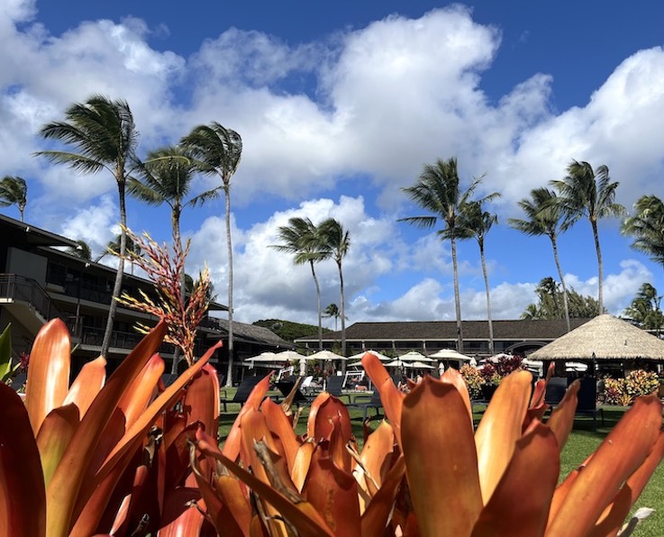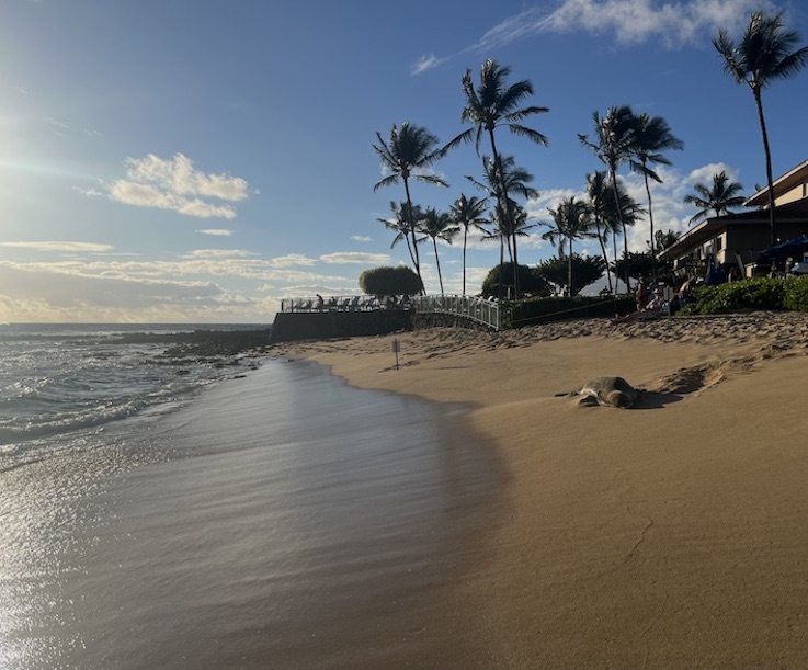 参加 Morning Stretch. 茵茵的大草坪上, 赤足面朝大海, 听着老师的指令, 踩着音乐的节奏, 开胯坐, 人面狮身式, 蝶式, 蛙式, 鸽式 …… 伸展胸大肌, 阔背肌, 三头肌, 四头肌, 梨状肌, 臀大肌, 臀中肌, 髂胫束, 腘绳肌, 腓肠肌 …… 45 分钟与大海共呼吸, 一呼一吸, 深又长. 身材苗条与否, 按下不表; 平衡功能和躯体的柔韧性, 就是这样实打实地练出来的. 课毕, Instructor Caren 出其不意地问: 今天有谁生日? 我扭捏了半秒, 还是举了手. 她将一串手工制作的项链挂在我的脖子上, 纯纯的夏威夷风情, 粒粒皆可爱. 喜呆了, 差点儿惊掉下巴, 恰似上台领奖, 迥异的是, 此时涛声响起来.