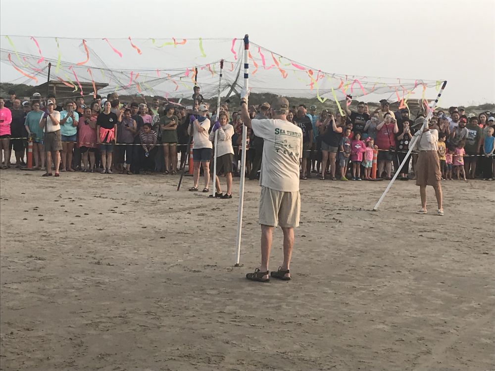 志愿者撑着网,随着小海龟慢慢往海边挪。地上那些小黑点就是海龟。Kemp's Ridley算是比较小型的海龟,刚出生的就更小了,真的也就大虫子那么大。