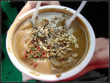 面茶、茶汤、杏仁茶和油炒面 – 面茶是糜子面做浓浓的粥的,有点儿像棒子面粥,上面撒一层芝麻酱和椒盐。正宗的喝法是沿着碗边转着圈地忒喽,不能拿勺舀。不过,这东西我好像小时候没怎么见到过,是后来回北京才在隆福寺小吃店吃到的。