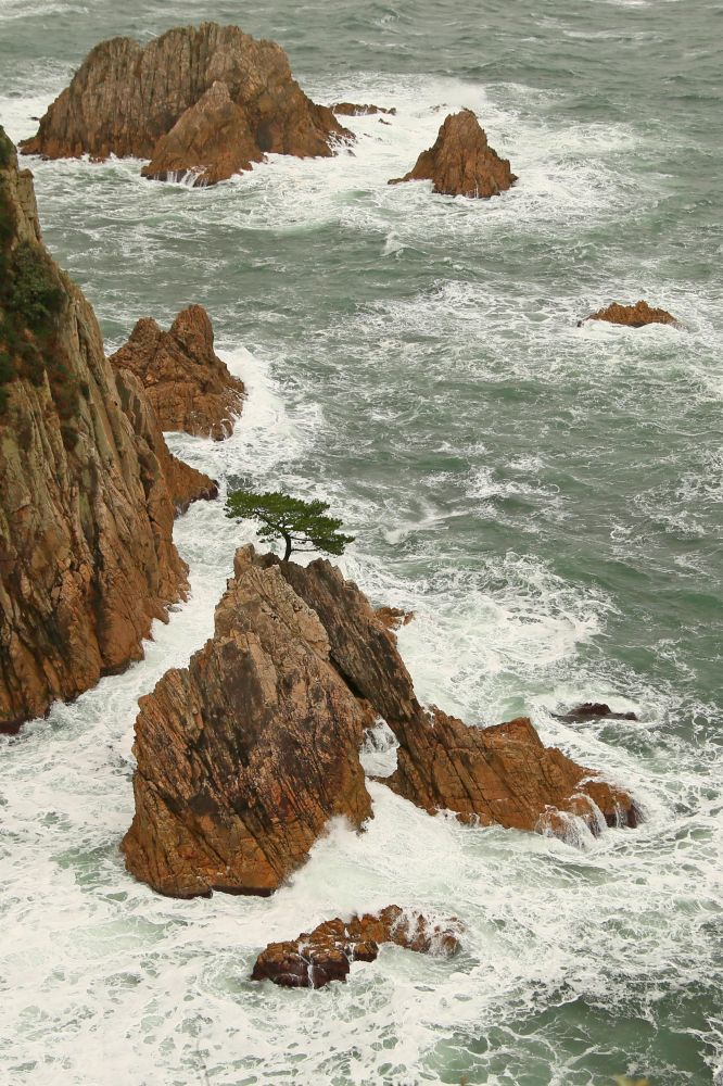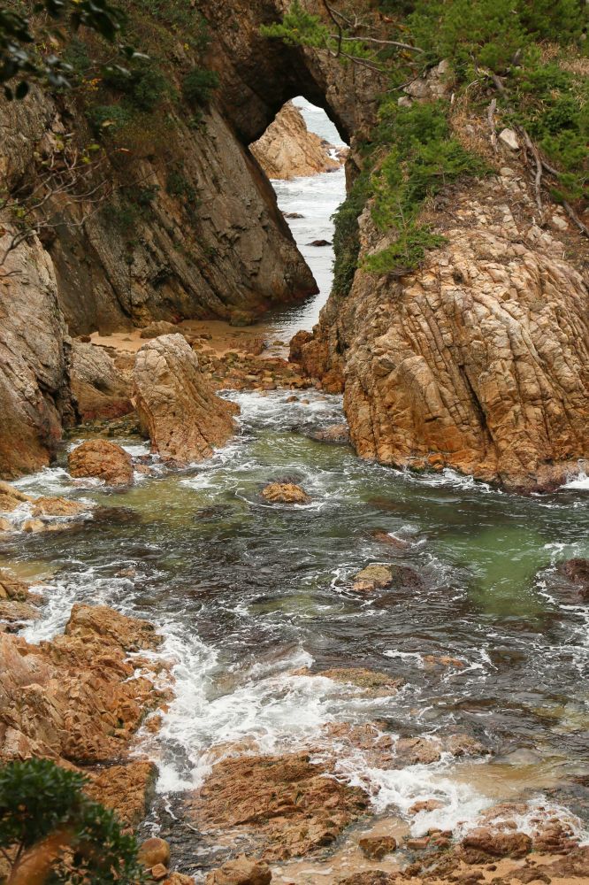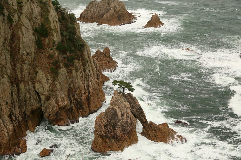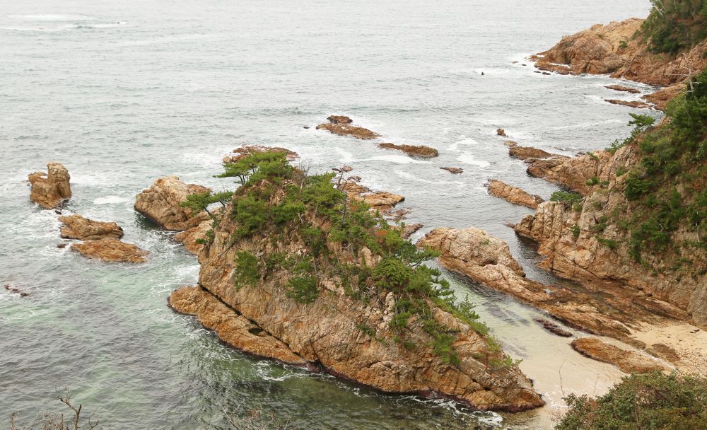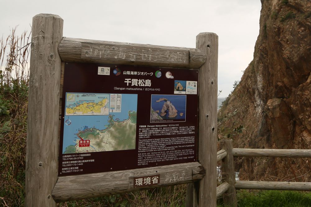 千贯松岛是整个浦富海岸的一大亮点,由岸上高处望去的确很有味道。我一直以为千贯松岛上有多少棵松树呢,结果人家孤零零的就一株,敢情这个贯字不是量词啊。展望台那儿有日英韩三语说明,说江户时期鸟取二代藩主池田綱清乘船巡视领地,偶见该岛,惊呼若有人能将此岛此松移至其宅中庭园即赐白银千贯,故名。故事挺有意思的,算算这棵松树年龄也有好几百年了吧。我记得在北加州名胜十七哩海岸线看到过一株孤柏,也是一派遗世独立的范儿,当时夕阳西照,海面上洒满金光,让我饱了眼福。这次千贯松岛在怒涛中岿然屹立的样子也给我留下难忘的印象。