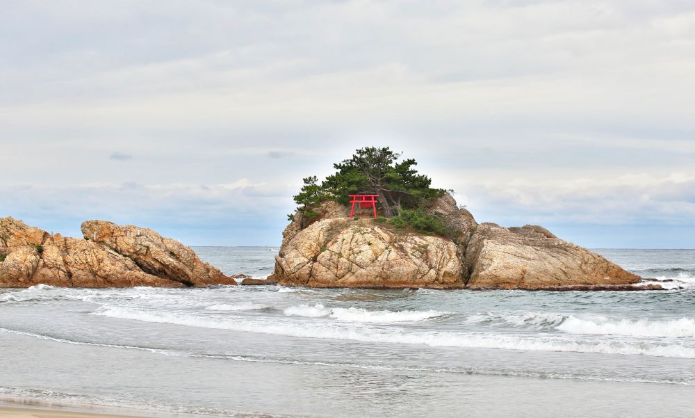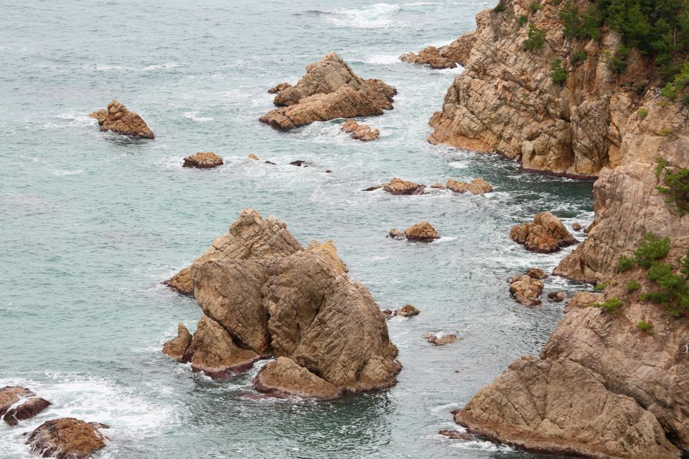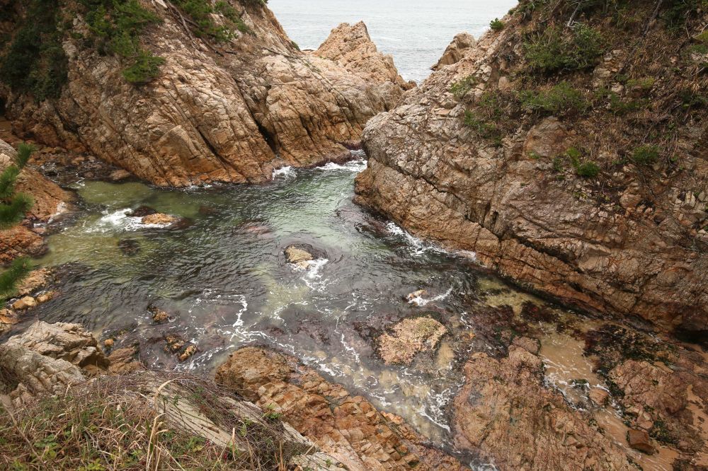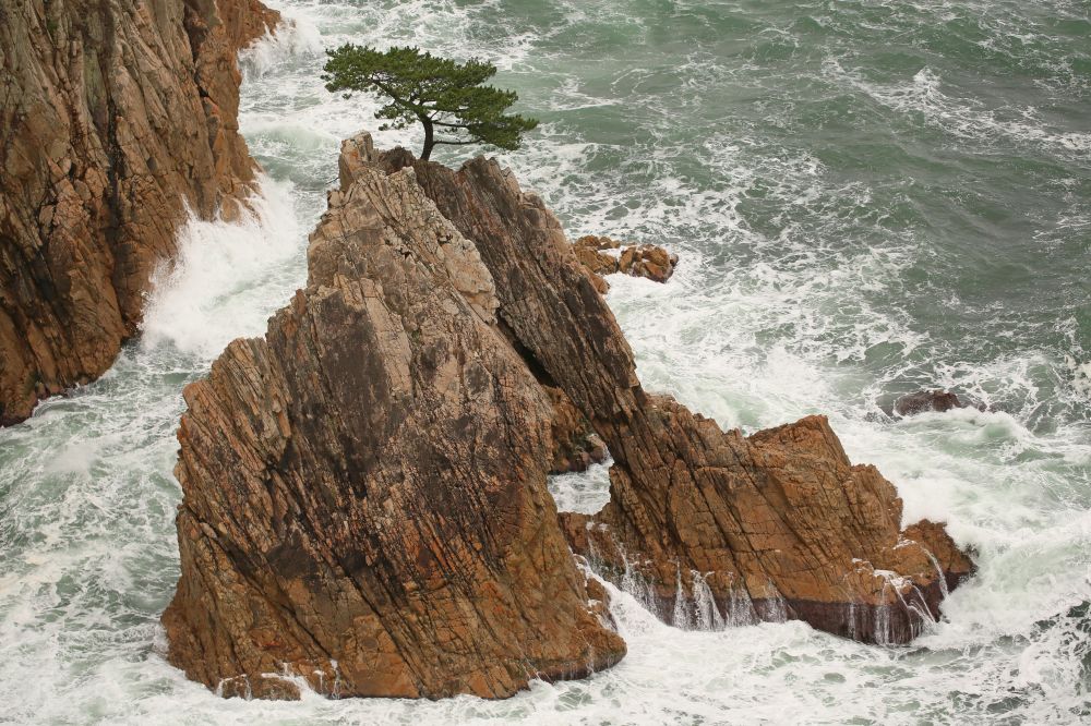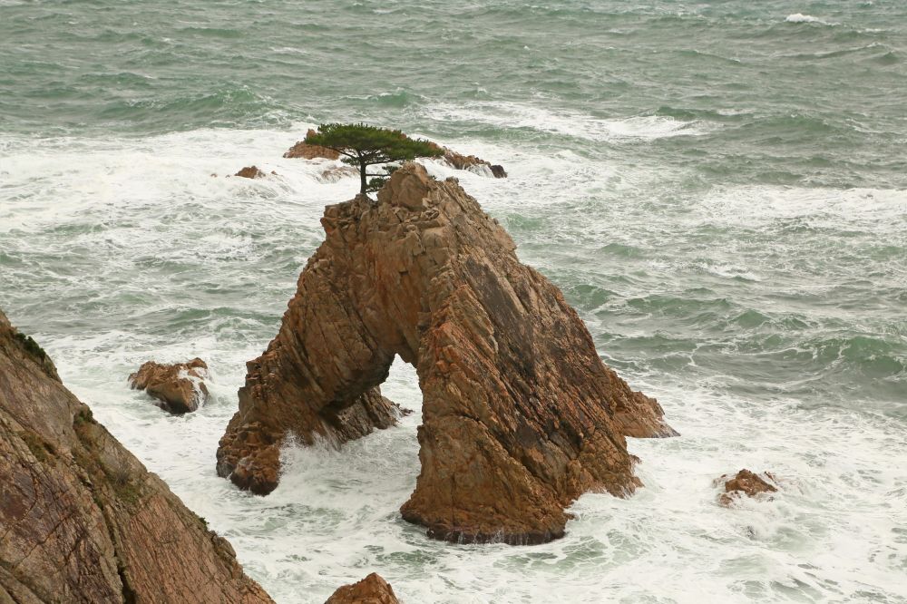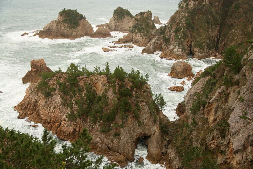 千贯松岛是整个浦富海岸的一大亮点,由岸上高处望去的确很有味道。我一直以为千贯松岛上有多少棵松树呢,结果人家孤零零的就一株,敢情这个贯字不是量词啊。展望台那儿有日英韩三语说明,说江户时期鸟取二代藩主池田綱清乘船巡视领地,偶见该岛,惊呼若有人能将此岛此松移至其宅中庭园即赐白银千贯,故名。故事挺有意思的,算算这棵松树年龄也有好几百年了吧。我记得在北加州名胜十七哩海岸线看到过一株孤柏,也是一派遗世独立的范儿,当时夕阳西照,海面上洒满金光,让我饱了眼福。这次千贯松岛在怒涛中岿然屹立的样子也给我留下难忘的印象。