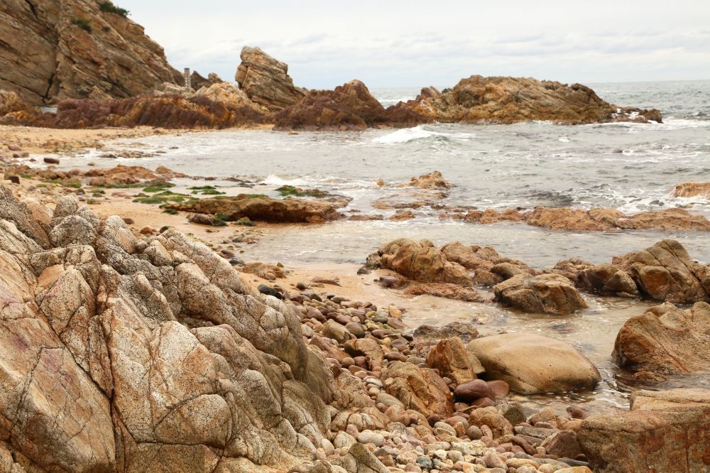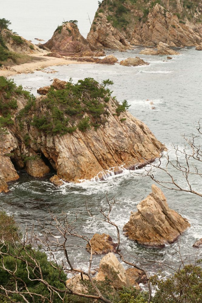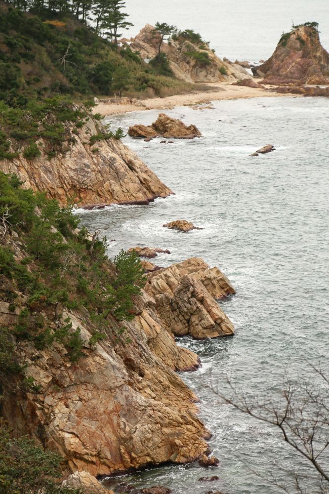 当天天气很不给力,一直阴沉沉的,不是看海的好日子,不过这有什么办法,随遇而安吧。我在小渔村看了一会渔民操作,就沿着浦富海岸一路往回走(网代)。浦富海岸是联合国教科文组织认定的山阴海岸国家地质公园的一部分,说海水清澈,透明度深达25米,结果我运气特差,当天风大浪高,全不透明啊。或许是十二月旅游热季已过,我当天走了三个小时,几度沿步道下到海边,连一个人都没看到。独立岸边,海中怪石嶙峋,怒涛拍岸,外带夹着细雨的阵阵阴风,真的有点吓人。