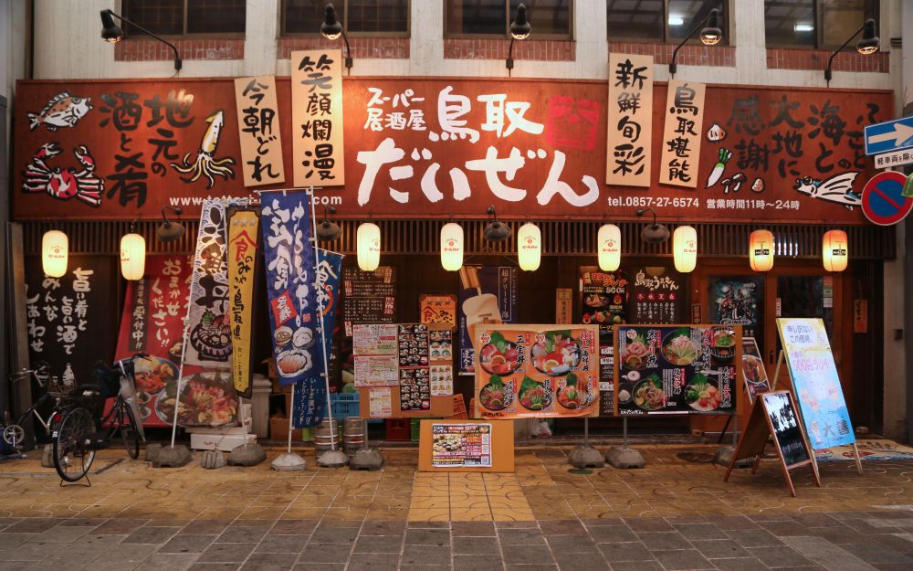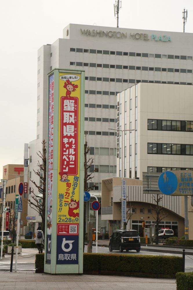 可能季节的关系吧,我一路上就没碰到几个游客,市区街道上也没有什么人气。有一个广告看板引起了我的注意,说,鸟取县已经改名为蟹取县,请大家多多捧场来吃螃蟹!嗐,为了摆脱旅游贫县的困境,鸟取也真是拼了呀。同情!