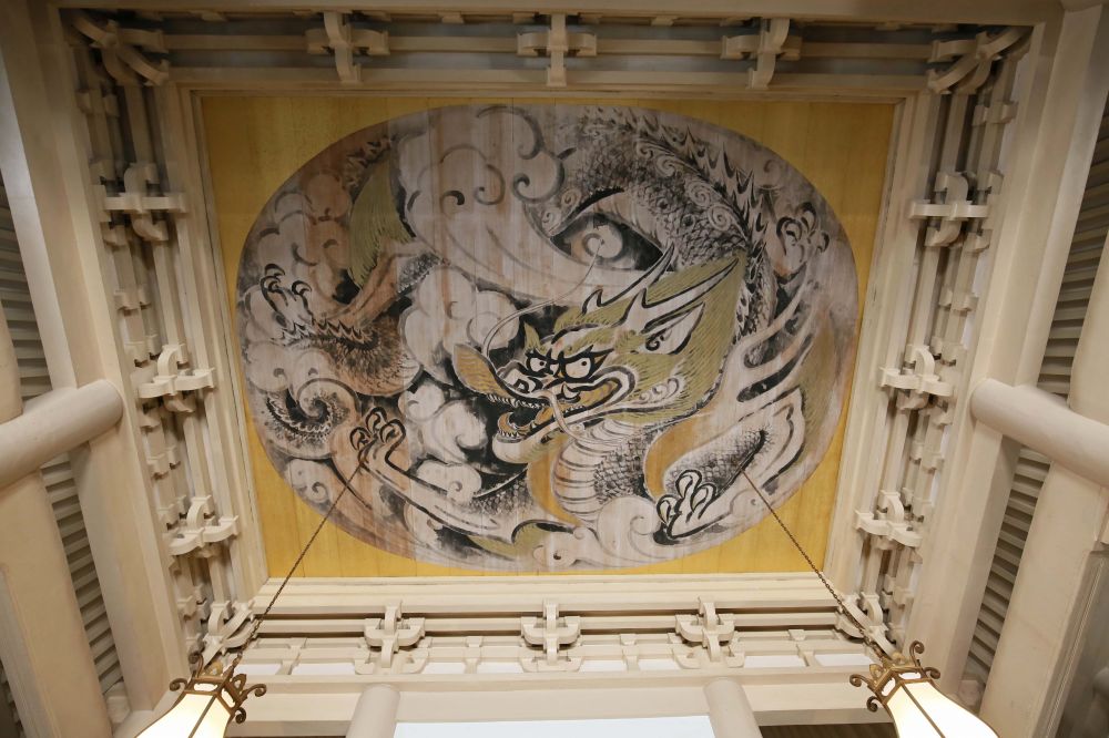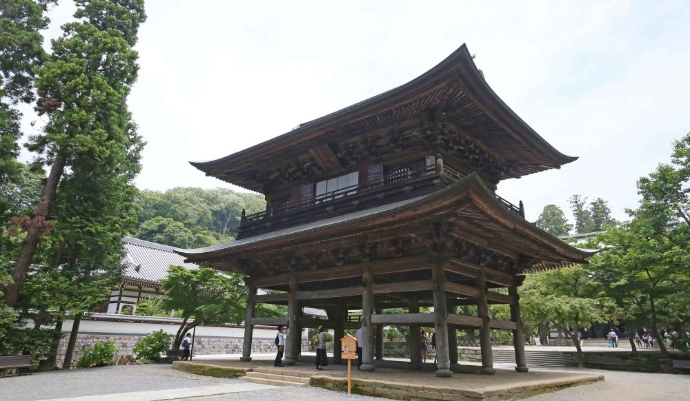三门之后就是佛殿,是禅宗样式全寺七堂伽蓝的中心建筑,1923年关东大地震(刚好去年是一百周年,横滨历史博物馆有大规模的纪念展)时全毁,1964年方得重建,外悬大光明宝殿横匾,为後光严上皇御赐。佛殿内供奉的主尊是宝冠释迦如来,也是华严宗的卢遮那佛,佛前天井上绘白龙图,风格跟建仁寺、建长寺的龙云图很不一样,为前田青邨画伯所作,比小泉淳一早得多。佛殿之后为方丈,方丈之后有名为妙香池的庭园,看网上照片挺漂亮的,可是我们决定省下时间去看梵钟,所以到了佛殿就撤了。圆觉寺的梵钟是国宝,为北条时宗之子贞时1301年进献的,铭文楷书十六個大字:皇帝萬歲 重臣千秋 風調雨順 國泰民安。读来倒是挺顺的,只不过日本哪来的皇帝啊,这个铭文抄袭汉文抄的有点不过脑子。玩笑归玩笑,这个宝贝是关东最巨大的洪钟,工艺精湛,是镰仓后期梵钟的代表作。