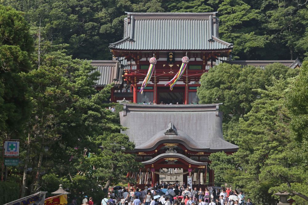 明月院之后就是建长寺,建长寺最值得细逛,上回已经详细记过了,我们直接跳到之后的鹤冈八幡宫吧。在北镰仓站到报国寺这一条线上,鹤冈八幡宫位居正中央,风水至佳,居高临下往海边方向望去,参道之后就是若宫大路,通往镰仓热闹的商业区。八幡宫有宝物殿,但是除了神舆之外,所藏的宝贝都是刀剑弓矢或文物之类。我们随便瞎逛,发现来神社祈祷参拜的人远远比寺庙要多,御朱印窗口的小姐姐(宫女?)忙得不可开交。