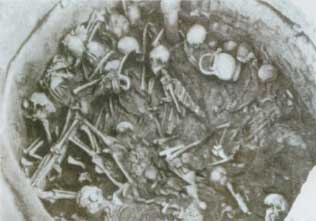 商古文化遗址中的墓葬 商祭祀坑中发现了不少无头奴隶遗骨,从这些遗骨的数量可以看出,商代盛行的人殉和牲殉的残酷性。图文引自:http://cathay.ce.cn/history/200609/01/t20060901_8381517.shtml这些大量带血的证据表明,中国土著文化被外来文化中断。