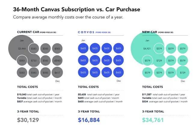 蓝色部分:使用Ford Canvas汽车订阅,每个月需缴纳605美元的汽车订阅费用,三年总汽车订阅费用为16884美元。