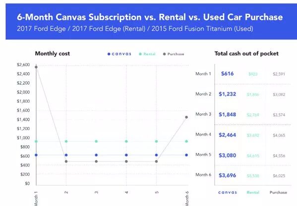Ford Canvas汽车订阅每月的汽车订阅费用616美元低于为期6个月的月租923美元的汽车租赁。虽然贷款购买二手汽车的月供要低于汽车订阅服务,用户需在第一月缴纳2591美元的首付,这也就使得时常为6月的汽车订阅对比汽车租赁和二手汽车贷款要有价格优势。