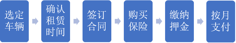 消费者可以选择线上或线下两种方式选车,并和车商确定租赁时间,一般租赁时间为1-3年。确认车型和租赁时间后,便进入合同签订阶段。签订合同时需要提供部分必要材料复印件,如:护照,Visa,驾照等。需要注意的是,在提车之前,长期租赁的车辆需要购买车险才可合法上路。提车时,租车者需要缴纳部分必要费用,以及安全押金(合同结束后押金将全部退还)。提车之后,可以每月支付账单。这一点需要和车行协商,一般的车行都会进行自动支付,需要租车者提供银行信息,进行授权。