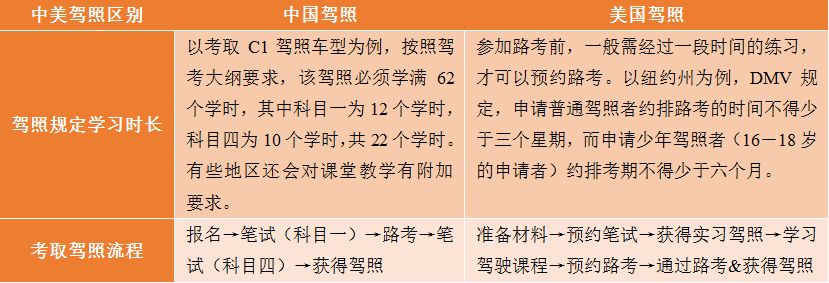 考驾照毋庸置疑是成为老司机的第一步。经常有人会问“中国驾照能不能在美国使用?”。因为各州的规定都不尽相同,海投君推荐大家在考取当地的驾照后,再上路。为了更直接的了解考美国驾照所需要的学习时长和一般流程可参考以下表格: