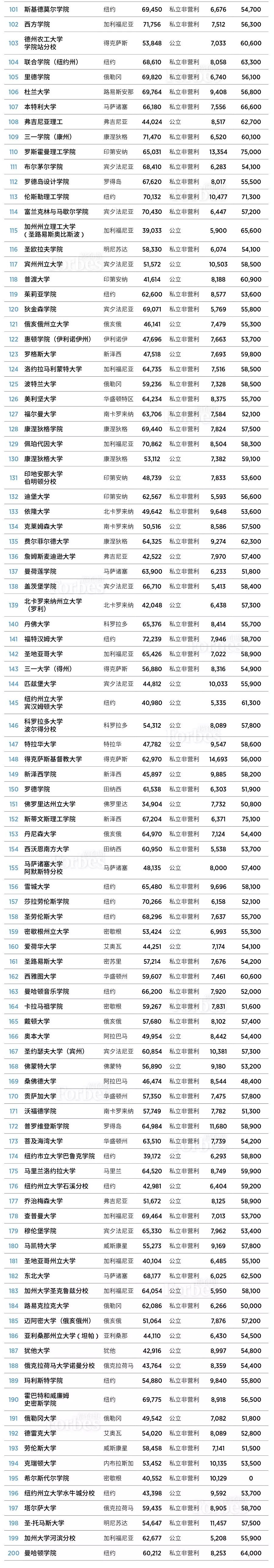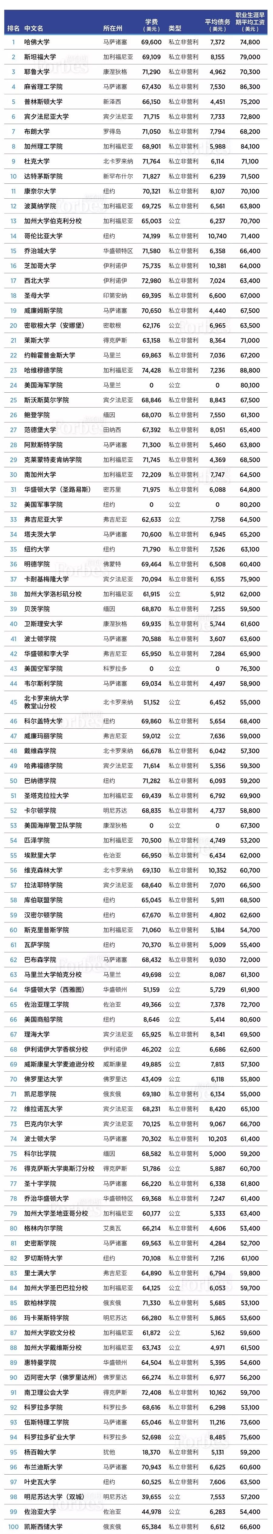 本榜单基于5个大类的指标:校友工资(20%)——按照联邦大学计分卡和PayScale数据及研究,结合考虑职业生涯早期和中期的薪酬;学生满意度(20%)——包括Niche对教授质量的调研和数据,以及联邦IPEDS网站显示的大一新生保留率;债务(20%)——学生债务负担低,违约率低,那么学校得分就更高;美国领袖(15%)——基于福布斯有关成功人士的数据库,包括亿万富豪、影响力女性、U30上榜者、公共部门和私人企业领军者等;按时毕业率(12.5%)——包括4年和6年毕业率;学术成就(12.5%)——校友获得罗德奖学金和富布赖特奖学金等著名奖助学金,或者得到博士学位,那么该校的得分就高。