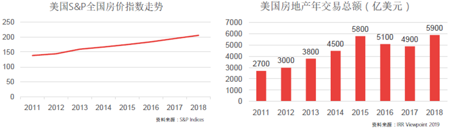 同时,美国房地产市场自经济危机以来持续回暖,市场复苏,房地产交易总额稳步上升。2011年至今全国房价总增幅高达50%,年平均增幅在6%左右。2018年全年美国房地产交易总额高达5900亿美元,创历史新高。