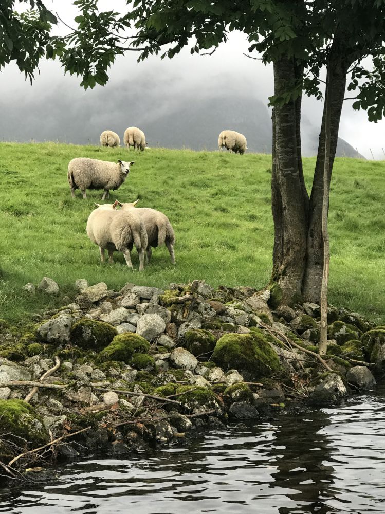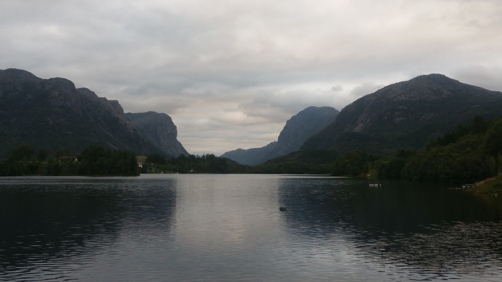 言归正传。离布道石不远的Ryfylke青年旅社不在下载的任何一个地图里。只有在谷歌线上地图能找到它,我把经纬度输入到TomTom里才成功导航。一路上心里打鼓这大部分地图上找不到的小旅馆靠不靠谱。从斯塔万格(Stavanger)坐轮渡到牛头镇(Tau),沿蜿蜒的水边向山里开了一阵,在一个几乎错过的路口拐上了一条仅容一辆车宽度的双向土路(在挪威很常见,普通双向公路也经常会突然变成仅容一辆车的宽度走一段,有一次我不得不倒车几百米给对面车让行),穿过一座颤颤巍巍的木板桥,来到了Ryfylke青年旅社门口。一下车就爱上了这个所在。旅社座落在山脚下,湖水边。往远看典型的冰川切成的“U”型谷中间流出一汪清水一直淌到面前,湖岸、草坡、树林、青山层次分明。草坡上零落着高耸屋脊的红色农舍,有一搭没一搭地散养着成群的牛、羊。