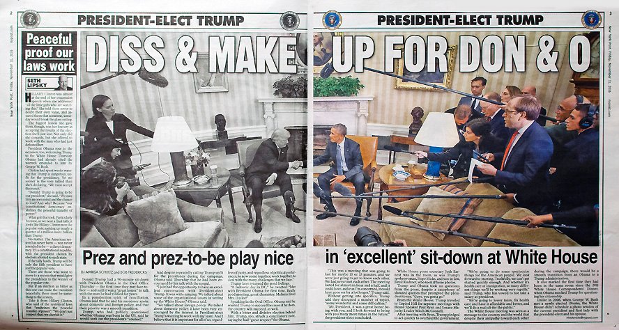 新闻,尤其政治新闻,更尤其世界政治新闻,千千万万,形形色色,左左右右,上上下下,虚虚实实,真真假假。不报道什么?报道什么?为什么不报道?为什么报道?如何报道?需要什么效果?怎样才能达到效果?实在是一种权力和利益的游戏。所以从来就认为新闻报道是主观的,是为政治和资本服务的。举一个显而易见通俗易懂的例子:在Obama和Trump第一次握手的那一天,买了一份报纸。虽然如今上网就可以看新闻,方便得很。但网上数字新闻随时可变,不如纸质报纸实在确凿。打开报纸看到一大幅有趣的新闻图片。通过看上去自然的排版设计使得图片成为一边是黑白色一边是彩色,一边人多一边人少!一边占地大一边占地小!其中的寓意是如此的显然。我不是Trump粉丝,仅仅就图论事。伟人说:要想知道梨子的滋味一定要亲口尝一尝。所以不要把别人的道听途说太当真。