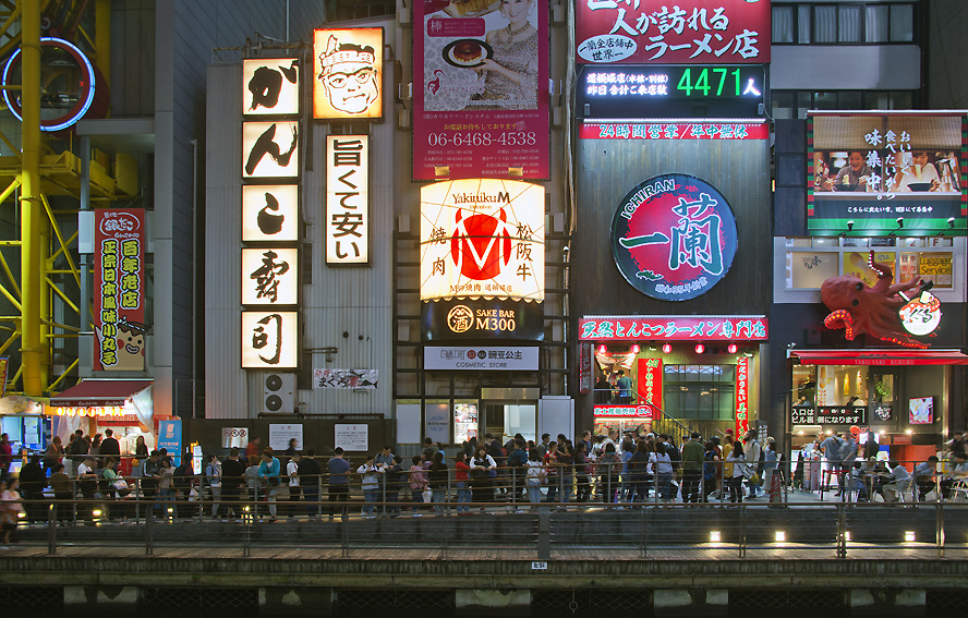 由于领导从上海同学那儿曾得到过这样的传说:日本的一澜拉面很好吃,不品尝一下的话居然会有人生遗憾。于是乎今年4月在大坂的一天晚上,正当饥肠辘辘地走在路上,寻思要找一家餐馆时,突然看到一块“一澜”拉面的红色招牌,那就好像看到一块天上掉下来的馅饼!尽管店门外流淌着长长的一队食客,需要花费40多分钟的人生光阴等候,但好像还是撼动不了吃面的决心。再加面店门口的红色广告上写着:年中无休,24小时营业,昨天来店人数4471!领导当即坚定拍板:排队等候吃拉面!
