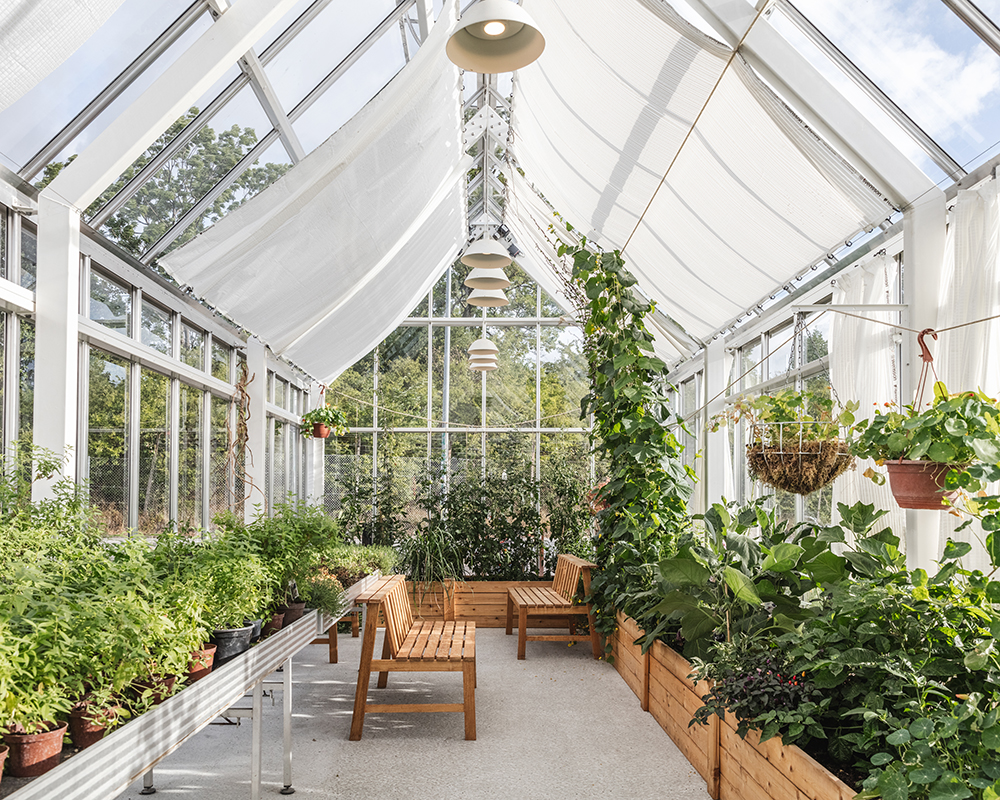 8 大尺度的天窗和宽敞的滑动推拉窗,让客人能真正感觉季节变化和餐厅周边的自然环境。 在外面,3个独立式玻璃房分别是餐厅花园,测试厨房和面包店。(摄影:Rasmus Hjortshoj)花房