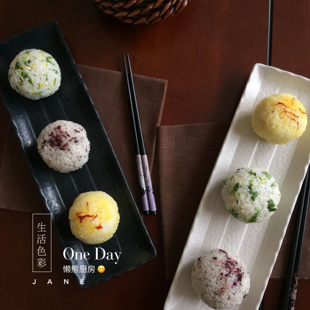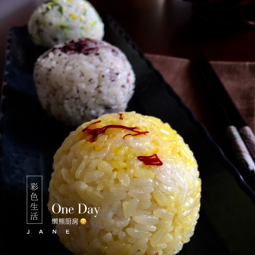 三色米团是柠檬米团,藏红花米团和紫苏米团。柱型用模具或杯子造型,圆型用保鲜膜。动手丰富你的餐桌吧!