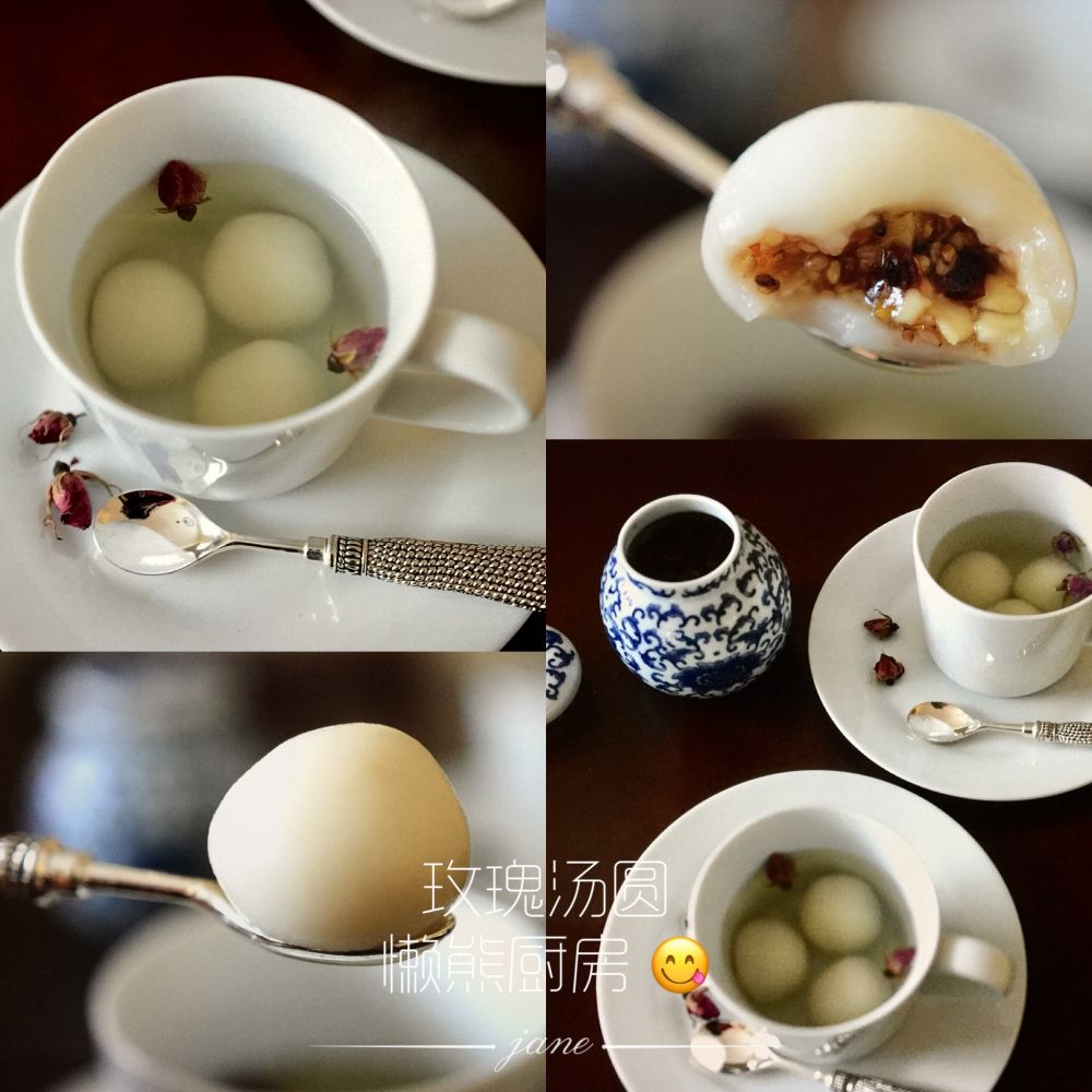 玫瑰汤圆:果酱,炒芝麻,炒杏仁,蔓越莓干,芒果干,玫瑰酱,黄油和糖做成馅子。